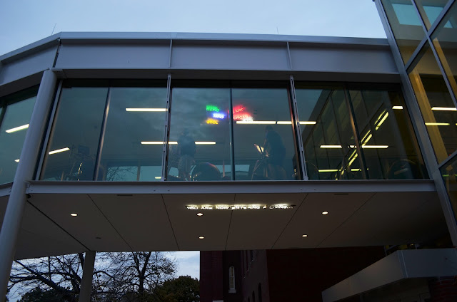 Composition: Shot looking up at the skywalk between State Gym and Beyer Hall. Emphasis was put on the glowing neon text. There is neon text throughout the building that have motivational words for the people working out.