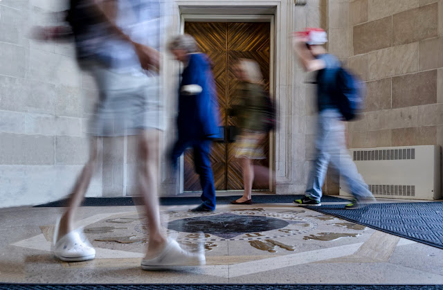 Composition: On axis with the wood door. By taking the photo low to the ground, the raised texture of the Zodiac can be seen. The tradition at ISU is that if one steps on the Zodiac, they will fail their next exam. As seen in the image, people old and young stick to the tradition in avoiding the Zodiac.